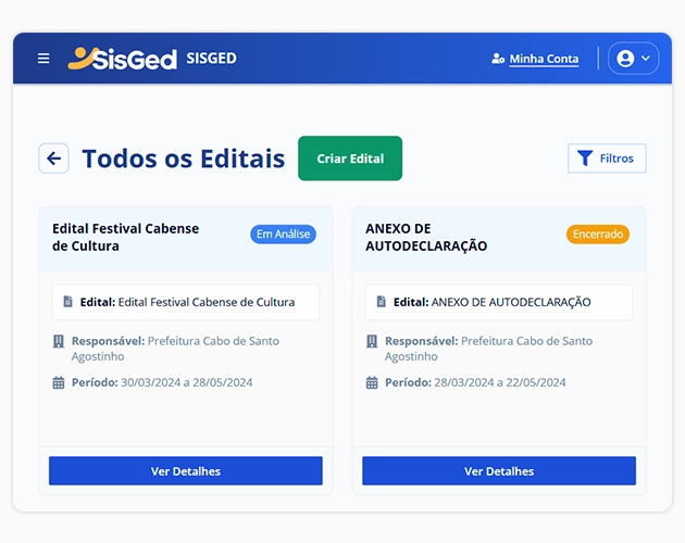 O SisGed é uma plataforma desenvolvida pela MHARK Consultoria e Treinamentos, projetada para otimizar a gestão de editais e projetos culturais. A solução permite que órgãos públicos administrem todo o ciclo de vida dos editais de forma eficiente e transparente, desde a criação até a prestação de contas.