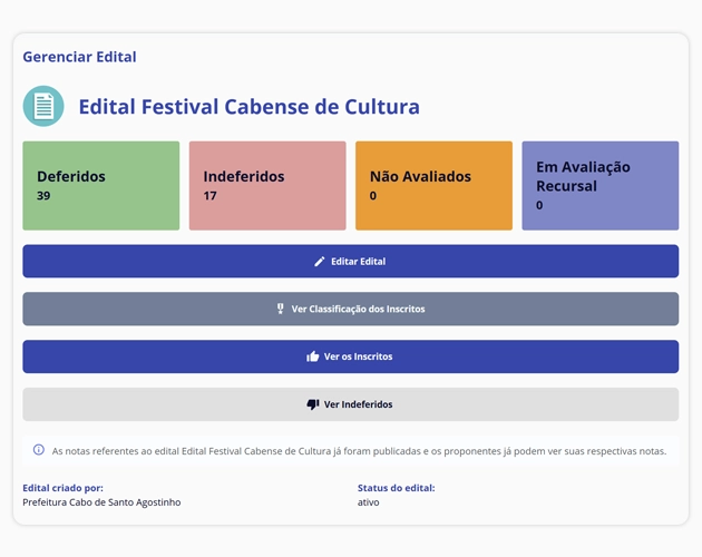 Permite o controle de todas as etapas dos editais em um único ambiente, com acompanhamento em tempo real desde a inscrição até a prestação de contas.